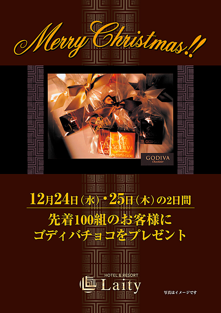 投稿日: 2025年11月5日 投稿者: laity-ownerホテル レイティのクリスマスプレゼント 12月24日(水)・25日(木)の2日間、先着100組のお客様にゴディバチョコをプレゼントいたします。