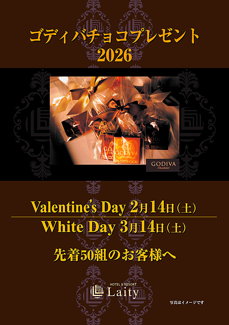 投稿日: 2026年1月7日 投稿者: laity-ownerバレンタインデー、ホワイトデーはゴディバチョコプレゼント バレンタインデー、ホワイトデーにホテルレイティをご利用の先着50組のお客様へ、ゴディバチョコをプレゼントいたします。